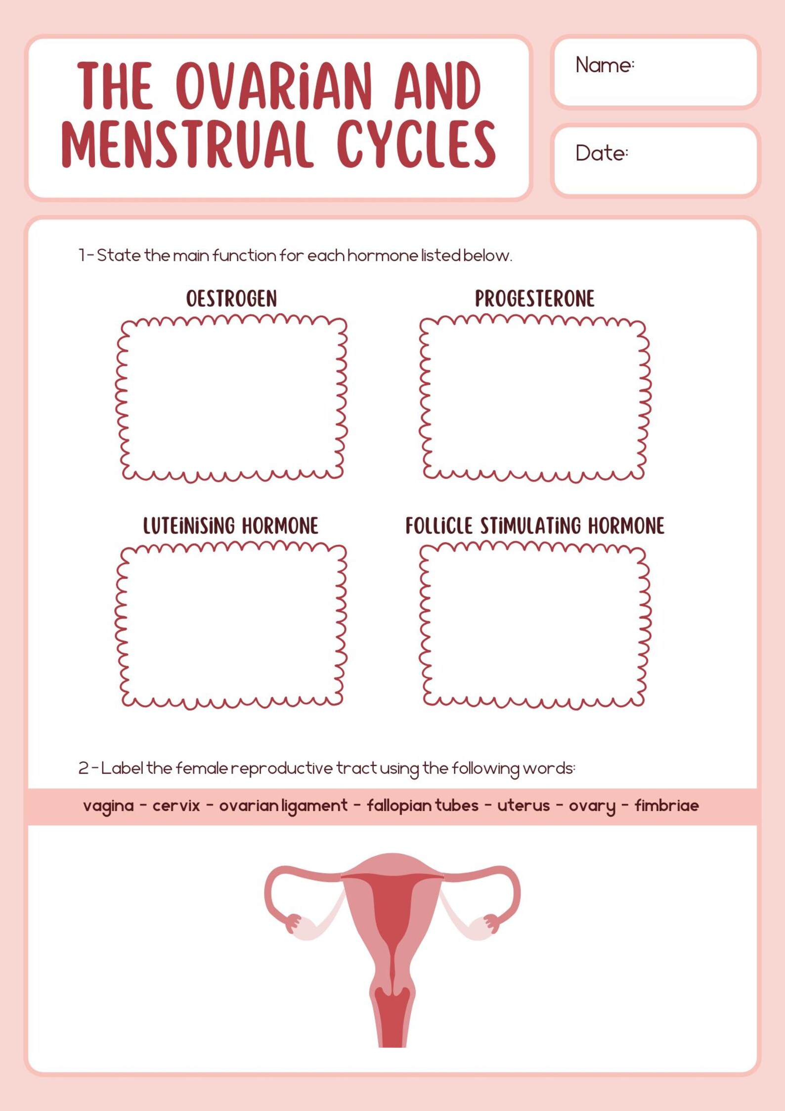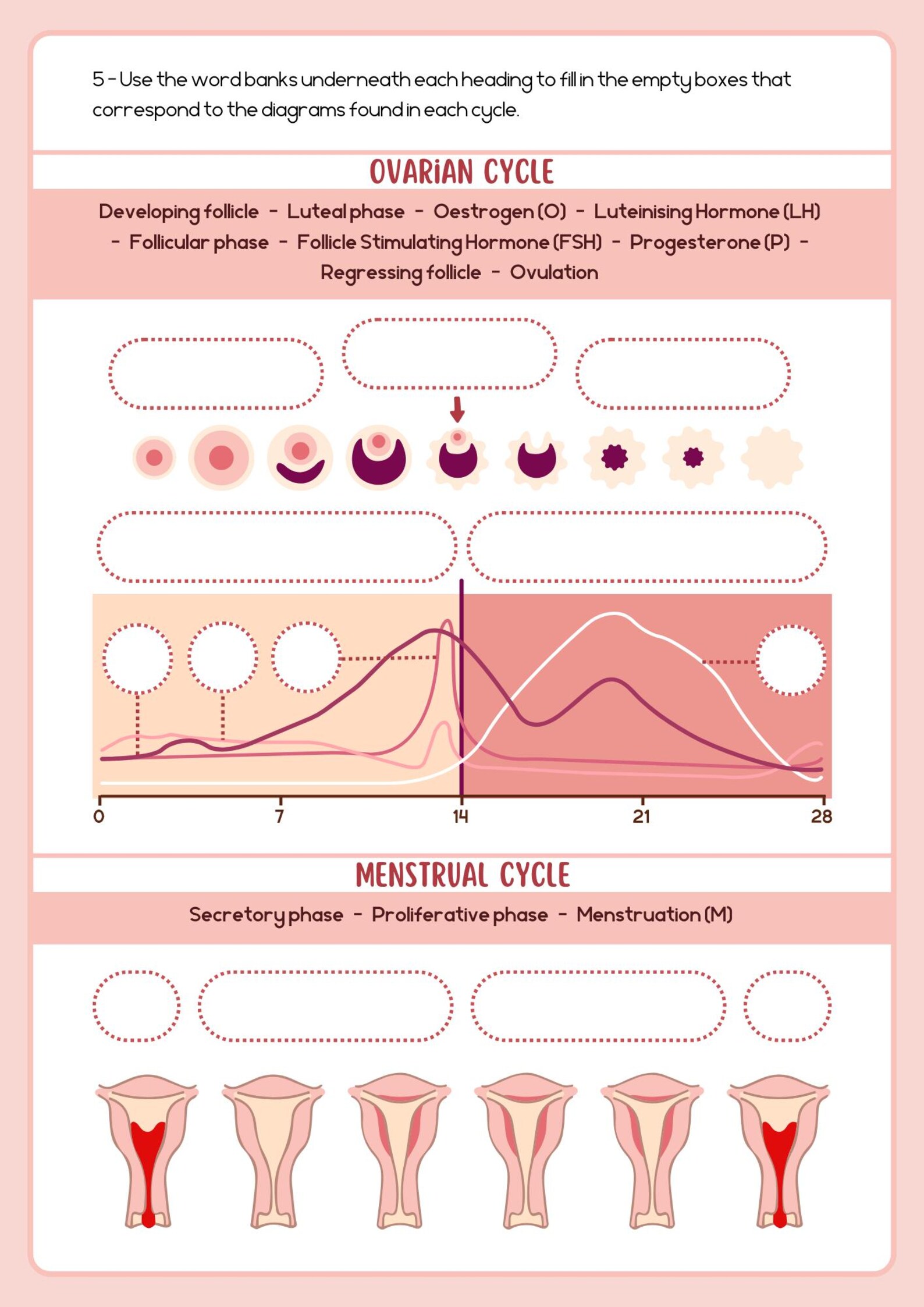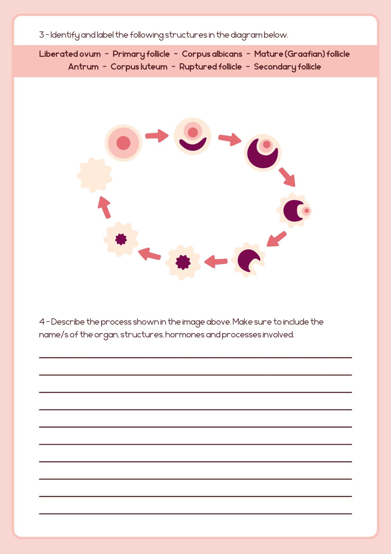 Hoja de trabajo rosa sobre ciclos ováricos y menstruales