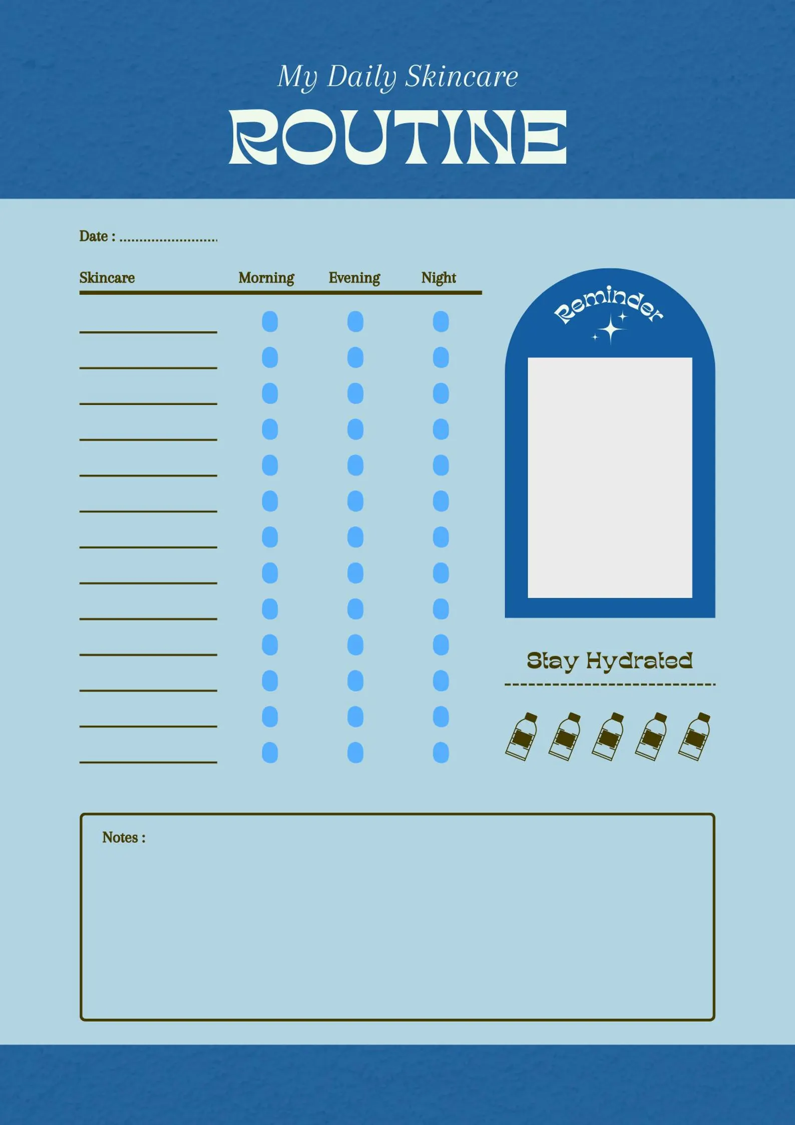 Registro de rutina diaria: documente sus rituales de cuidado de la piel por la mañana y por la noche, asegurándose de no perderse ningún paso en su viaje hacia una piel radiante.
