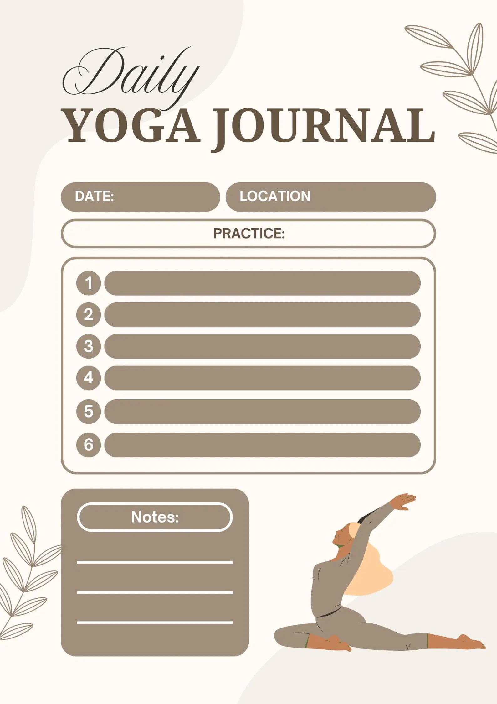 Nuestro planificador diario de yoga floral ilustrado en color beige y marrón es la combinación perfecta de creatividad y organización. Mejora tu práctica de yoga, cultiva la atención plena y reflexiona sobre tu viaje de bienestar con este exquisito planificador. ¡Comienza tu viaje hoy!